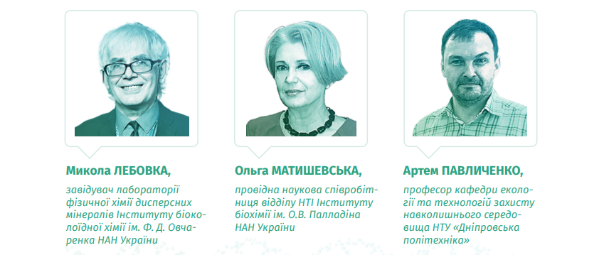 Ці та інші питання ми поставили завідувачу лабораторії фізичної хімії дисперсних мінералів Інституту біоколоїдної хімії ім. Ф.Д. Овчаренка НАН України Миколі ЛЕБОВЦІ, провідній науковій співробітниці відділу НТІ Інституту біохімії ім. О.В. Палладіна НАН України Ользі МАТИШЕВСЬКІЙ і професору кафедри екології та технологій захисту навколишнього середовища НТУ «Дніпровська політехніка» Артему ПАВЛИЧЕНКУ.
