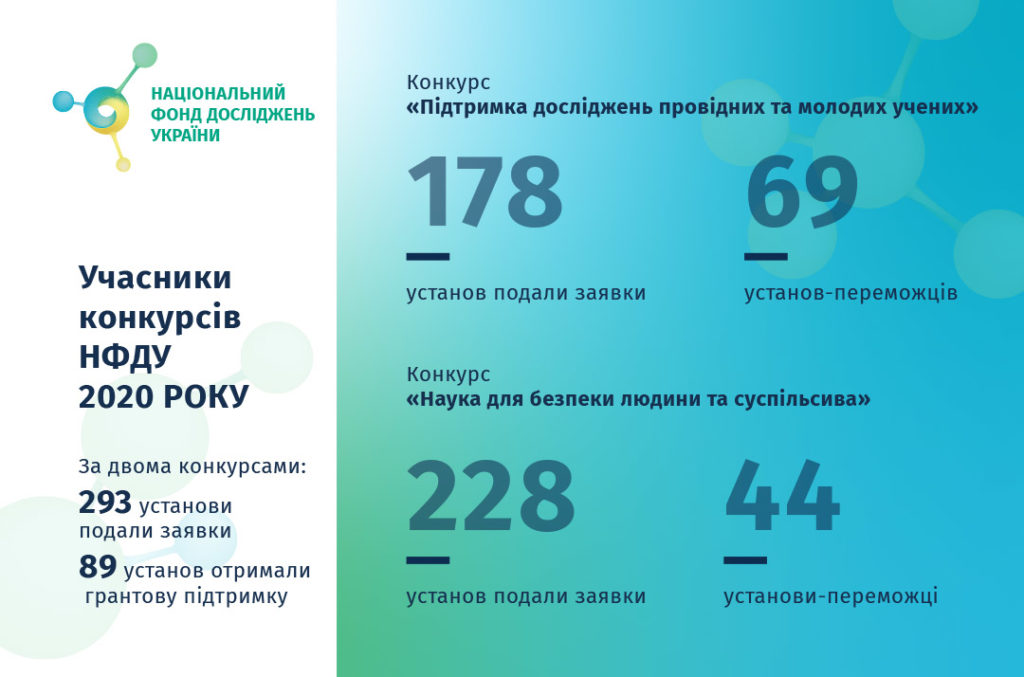 Національний фонд досліджень пропонує до вашої уваги інфографіку, яка відображає кількість установ-учасників та установ-переможців за двома конкурсами проєктів із виконання наукових досліджень і розробок – “Наука для безпеки людини та суспільства” та “Підтримка досліджень провідних та молодих учених”.