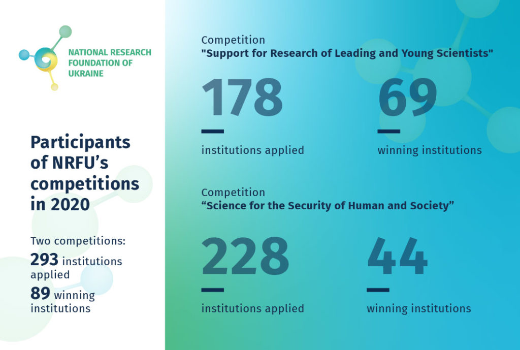 The National Research Foundation presents infographics that display the number of participating institutions and winning institutions in two competitions for research and development projects – “Science for the Security of Human and Society” and “Support for Research of Leading and Young Scientists”.