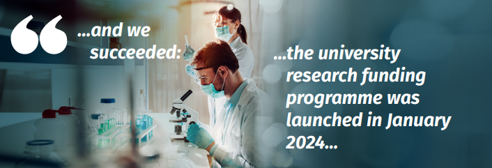 And we succeeded: the university research funding programme was launched in January 2024. Researchers were able to start research at the beginning of this year. However, there is still a lot of work to be done in this area.