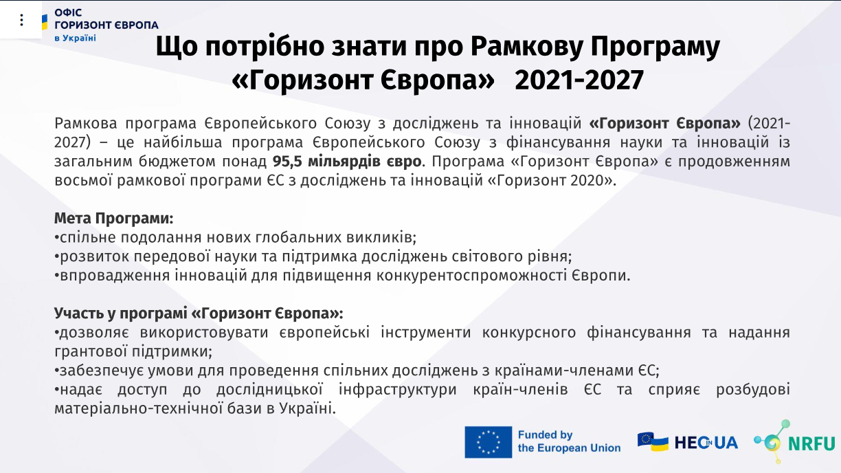 Однією з таких міжнародних програм є Рамкова програма Європейського Союзу з досліджень та інновацій «Горизонт Європа» (2021-2027). Це найбільша програма ЄС з фінансування науки та інновацій із загальним бюджетом понад 95,5 млрд євро. Керівник «Офісу Горизонт Європа в Україні» Ігор Таранов розповів про мету Програми та переваги й можливості, які відкриваються для її учасників. Адже участь вітчизняних науковців у ній має виняткову важливість, оскільки дозволяє використовувати європейські інструменти конкурсного фінансування, забезпечує умови для проведення спільних досліджень із країнами-членами ЄС, а також надає доступ до міжнародної дослідницької інфраструктури та сприяє розбудові матеріально-технічної бази в Україні. Також керівник Офісу порівняв Програму «Горизонт Європа» із попередньою Рамковою програмою «Горизонт 2020», кількість учасників та показники успішності. Крім того, він розповів про роботу «Офісу Горизонт Європа в Україні» та підбив підсумки діяльності на сьогодні.