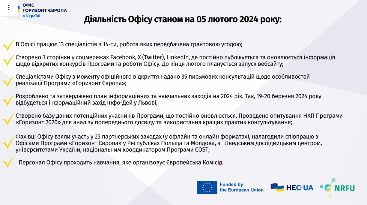 6 лютого на базі Українського інституту науково-технічної експертизи та інформації провели вебінар на тему: «Національний фонд досліджень України та «Офіс Горизонт Європа в Україні»: міжнародна грантова підтримка та конкурсні можливості для українських дослідників та інноваторів». Учасники дізналися про грантову підтримку, яку надає НФДУ, а також про можливості Рамкової програми «Горизонт Європа» для вітчизняних науковців, інноваторів, МСП, бізнес-структур.