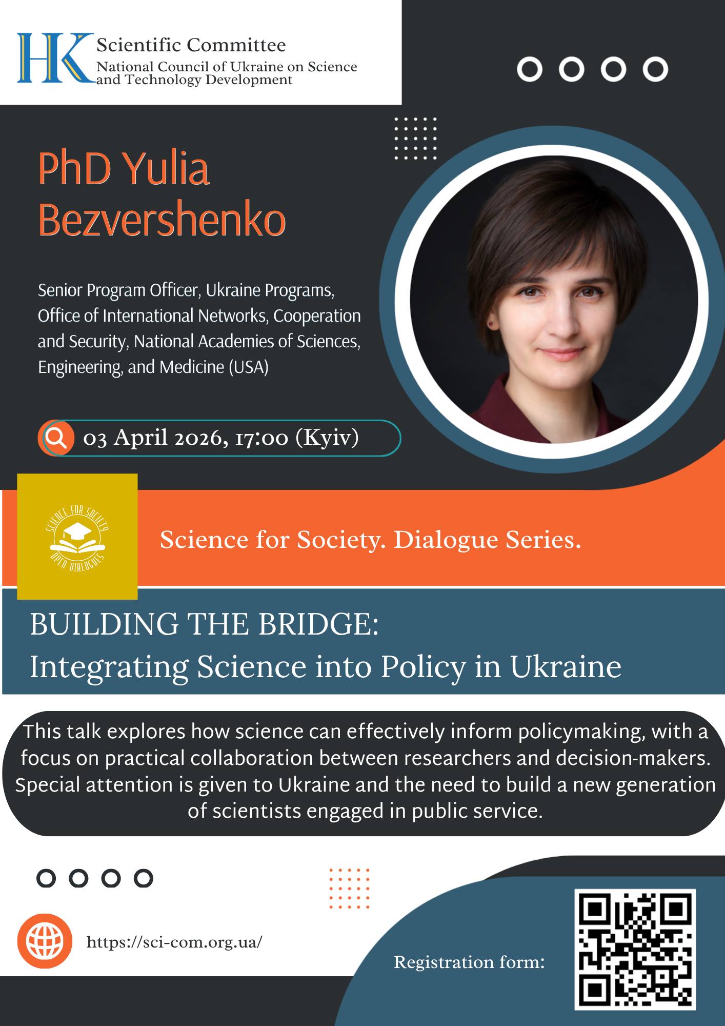 У межах запуску серії 03 квітня 2026 року о 17:00 відбудеться перший онлайн-семінар на тему: «Будуючи міст: інтеграція науки у формування політики в Україні»