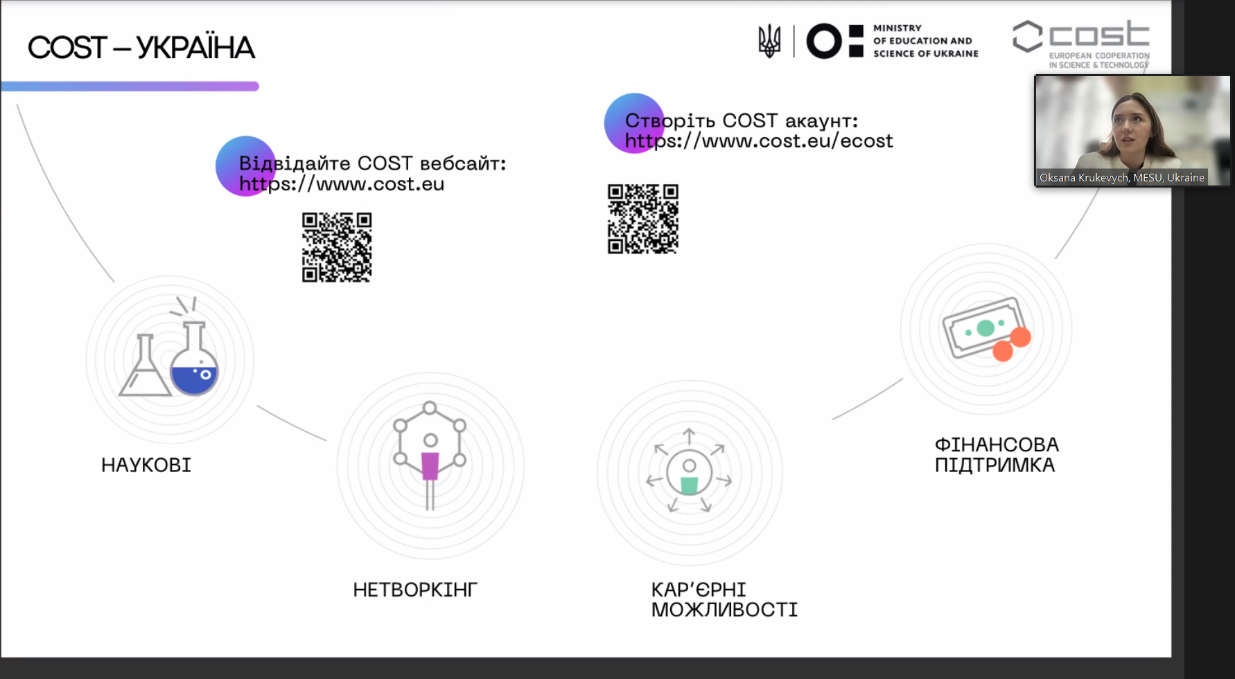 Оксана Бережна розповіла про діяльність Асоціації, можливості долучитися до мережі Дії COST, створеної для покращення здатності вирішувати наукові, технологічні та суспільні виклики, рамки фінансування, а також про порядок подання заявок аплікантами на фінансування нових проєктів та пошуку партнерів для участі у спільних заходах. Координаторка наголосила на важливості участі в Діях для подальшої можливості брати участь у Програмі «Горизонт Європа». Зокрема, було зазначено, що Дії допомагають об’єднати дослідницькі ініціативи в Європі та за її межами, дозволяють науковцям та інноваторам розвивати свої ідеї в будь-якій галузі науки і технологій, ділячись ними з колегами, сприяють дослідженням, інноваціям і кар’єрі дослідника.