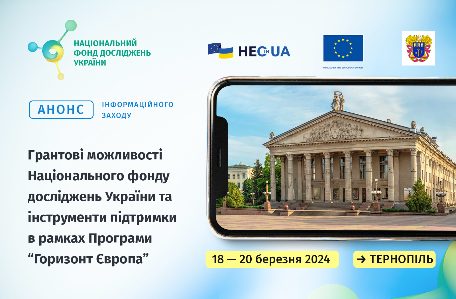 Анонс заходу з поширення інформації, присвячений грантовим можливостям НФДУ й інструментам підтримки в рамках Програми «Горизонт Європа» у Тернополі
