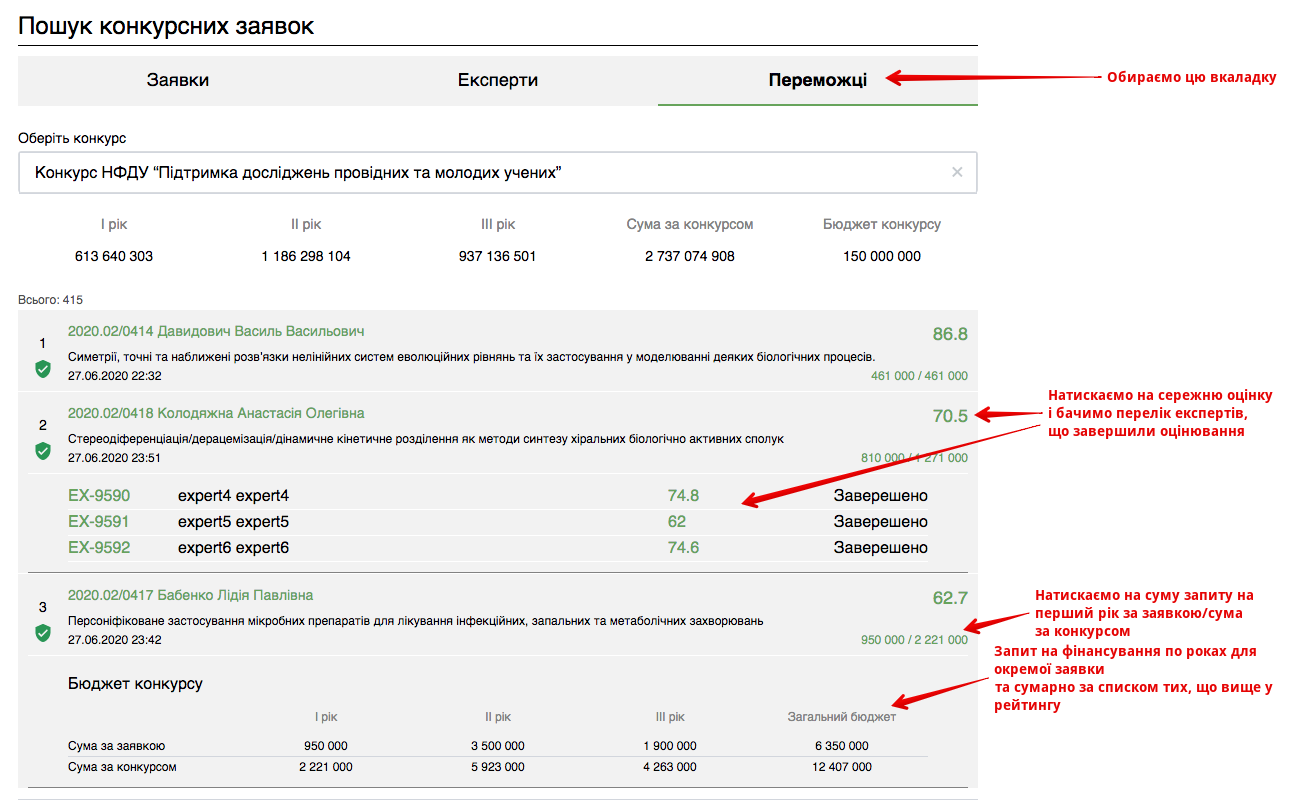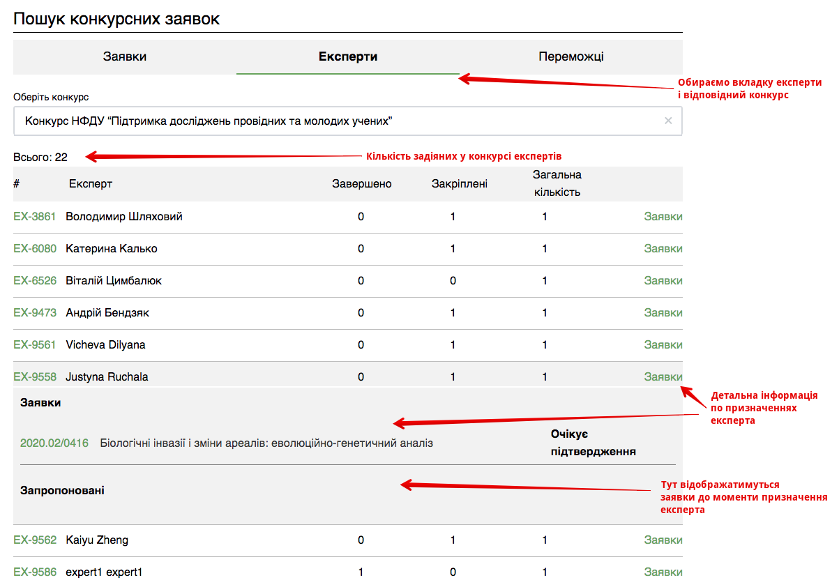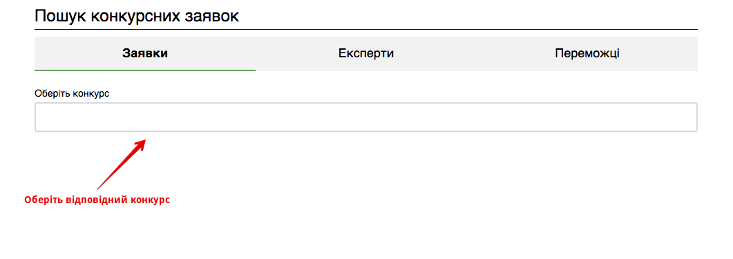 Спочатку обираємо один з підрозділів “Заявки”, “Експерти” або “Переможці” потім відповідний конкурс.