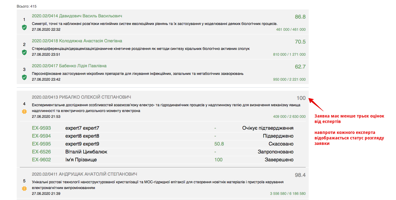 Заявки, які оцінені не менш як трьома експертами мають зелений значок біля їх номера у списку. Для заявок, які оцінені менш як трьома експертами, значок має жовтий колір.