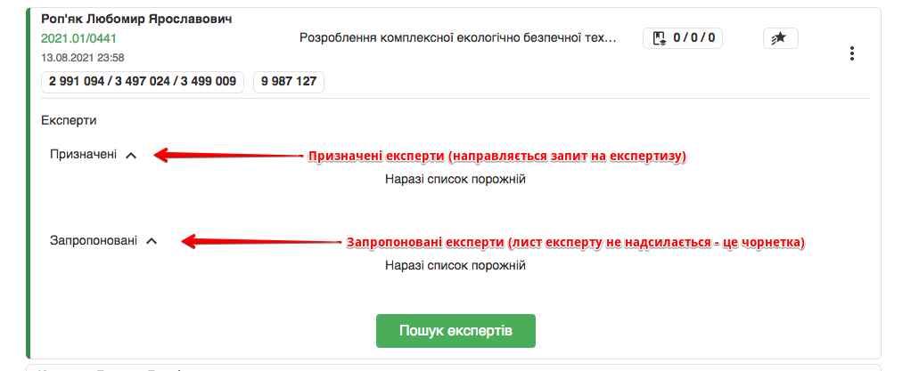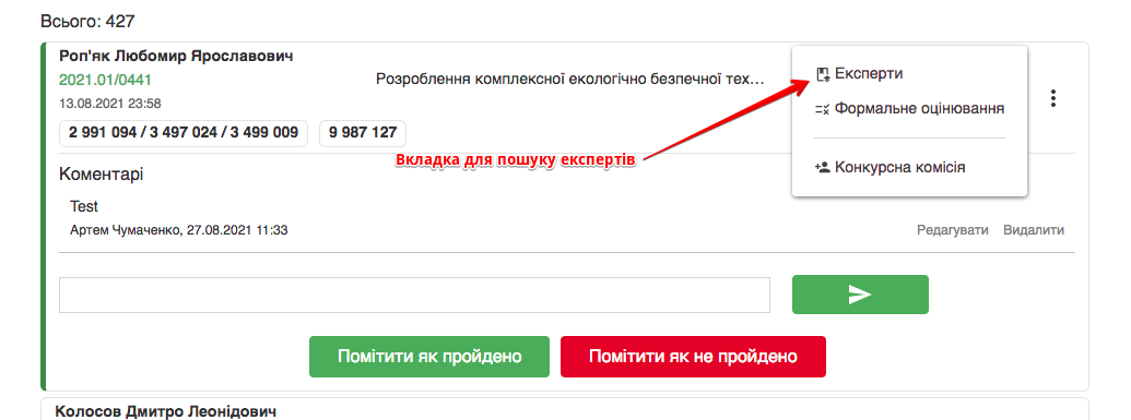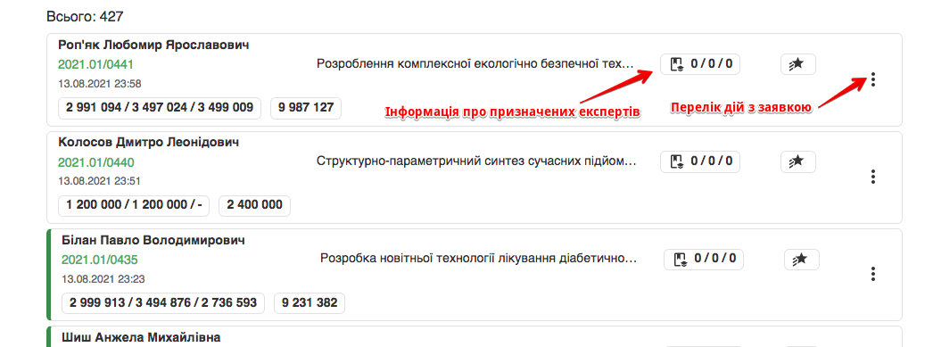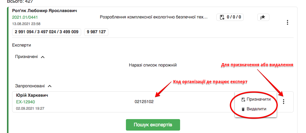 При обранні певного проєкту зі списку можна обрати поле “Експерти [3/1/4]” де 3- експерти закінчили оцінювання, 1- експерт підтвердив свою участь у оцінюванні цього проєкту, 4- експерти всього були призначені до цієї заявки. Оцінку кожного експерта можна скасувати тоді вона не буде враховуватись при підрахунку середнього балу за заявкою.