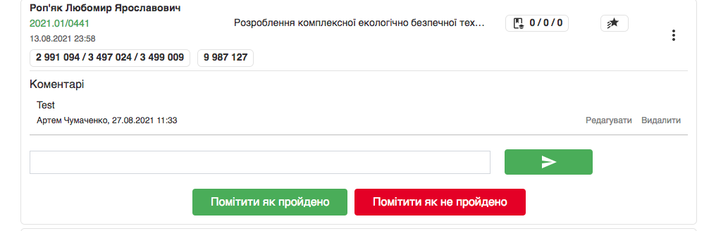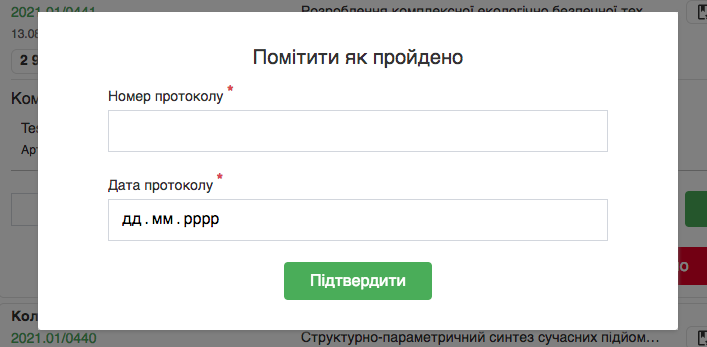 Якщо заявка не пройшла за формальними ознаками натискається кнопка “Помітити як не пройдено”. У обох випадках після натискання кнопки треба надати формальну інформацію про номер протоколу і дату, яким комісія конкурсу затвердила відповідне рішення. У випадку відхилення проєкту за формальними ознаками необхідно також надати коментар з причиною скасування проєкту.