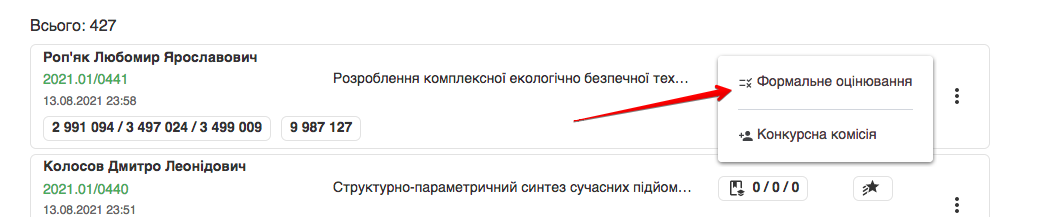 Першим кроком при роботі з заявкою необхідно вказати інформацію про те чи пройшла заявка процедуру формального оцінювання. Для цього необхідно натиснути на вертикальні крапки вказані на рисунку вище. Обрати з переліку пункт “Формальне оцінювання”