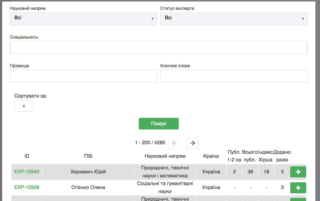 Натискаючи на зелений хрестик напроти прізвища експерта куратор додає його до списку запропонованих експертів.